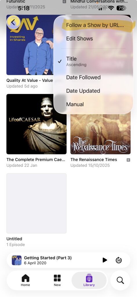 The screenshots are from Apple’s Podcasts app but the same basic method applies to any podcast app.